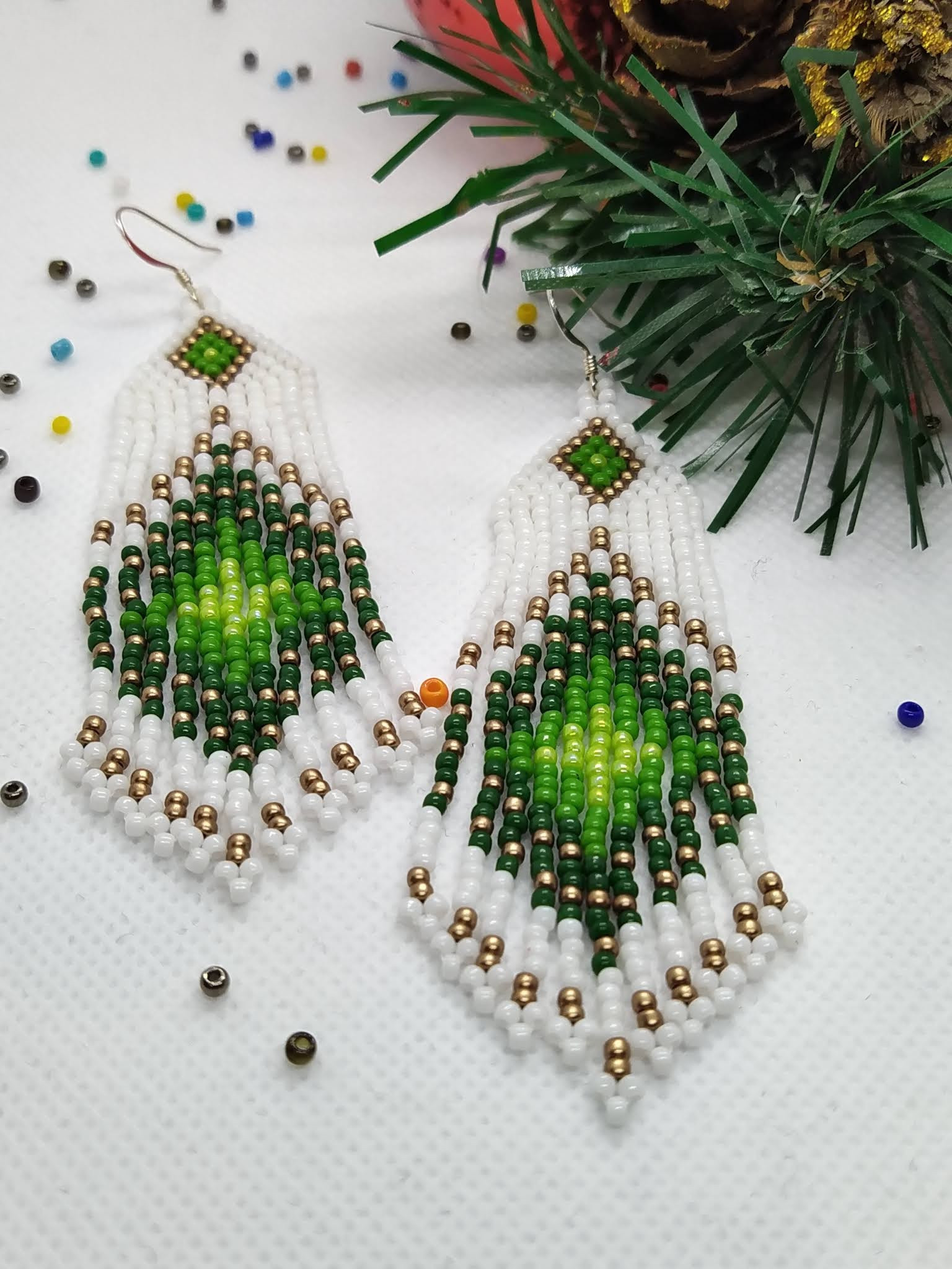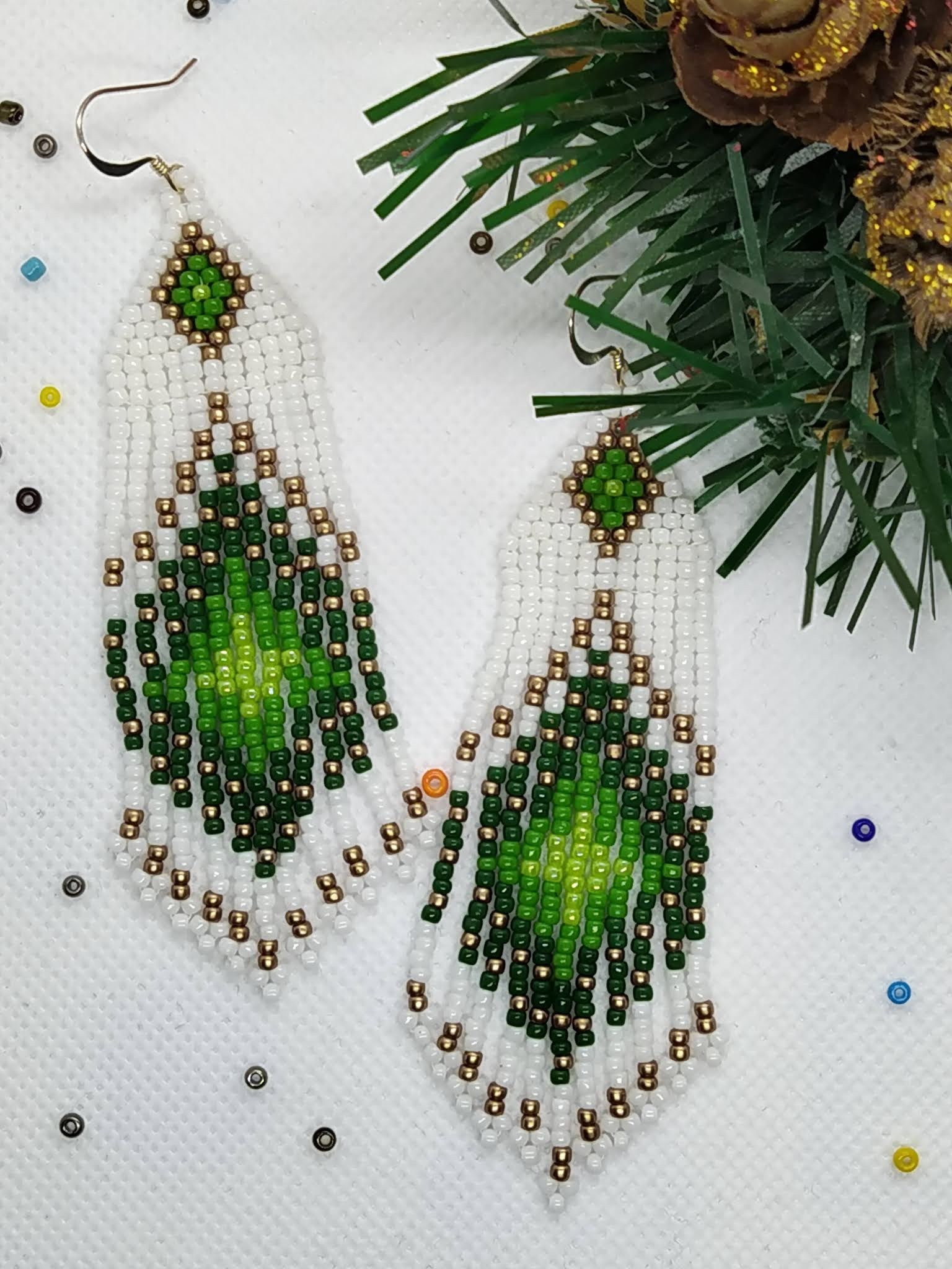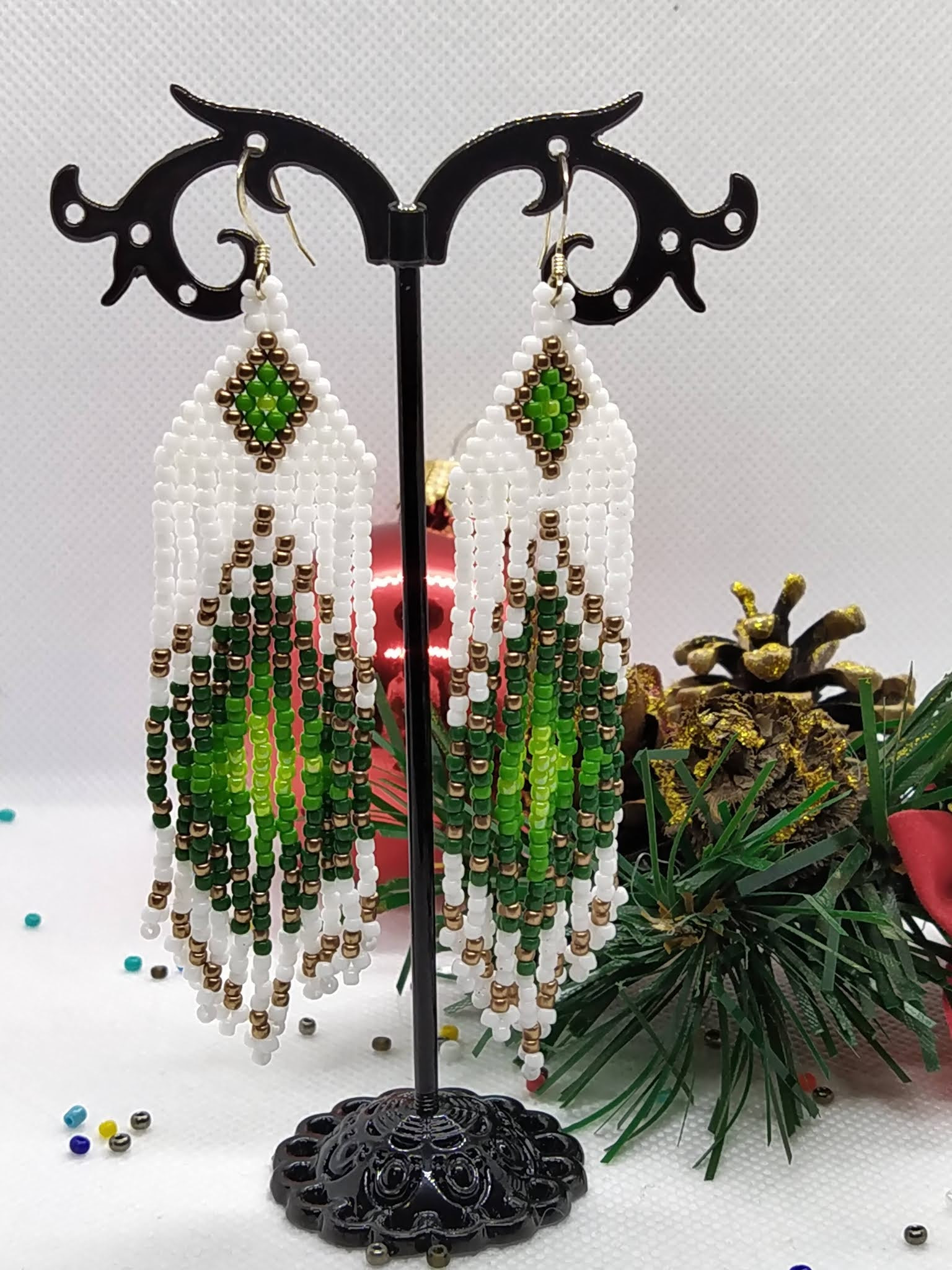 Cercei lungi, cu franjuri, lucrați manual din mărgele Toho 11/0, Tortițe argintate